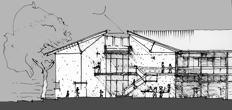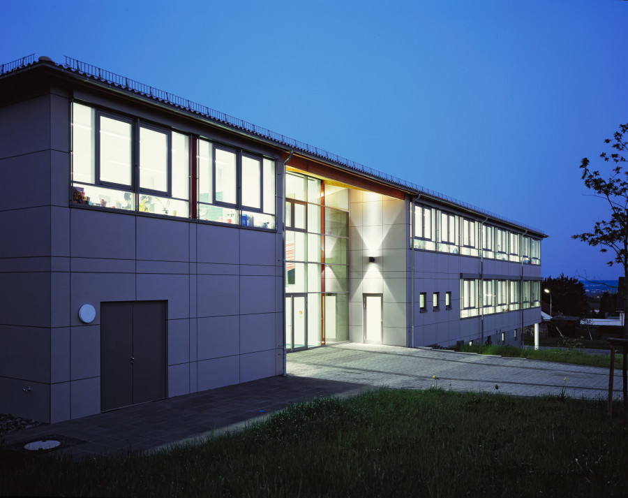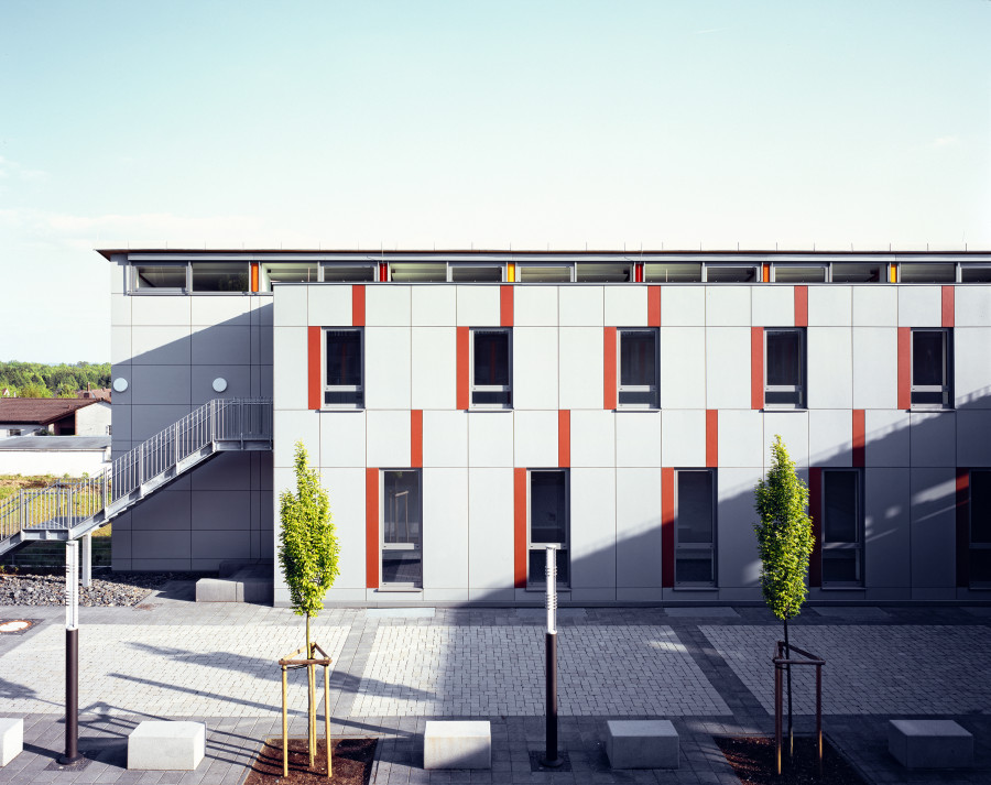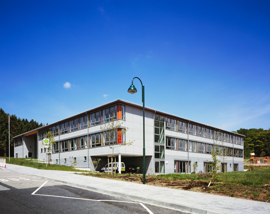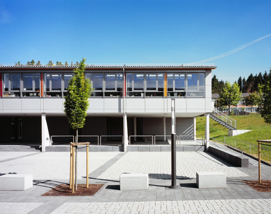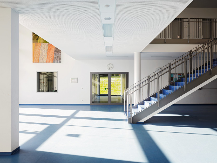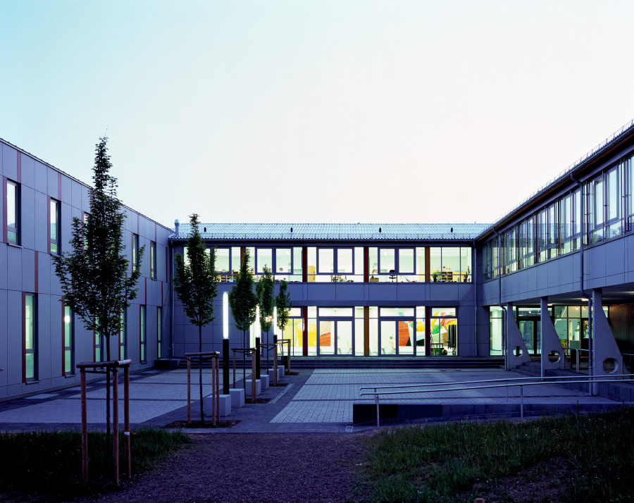 Neubau einer 2-zügigen Förderschule mit Ganztagsbetreuung. Die U-förmige Anlage der Berggartenschule öffnet sich zum angrenzenden Landschaftsraum, der in den Pausenhof übergeht und integraler Bestandteil der Schule wird. Unter Ausnutzung der Topographie wird die Schule auf zwei Hauptebenen organisiert. Die Klassen-, Kurs- sowie Lehrräume sind auf der oberen Ebene angeordnet, während Verwaltung, Lehrküche und Ganztagesbereich sich als abgeschlossene Einheit im Erdgeschoß mit direktem Zugang zum Pausenhof und der Eingangshalle befinden.