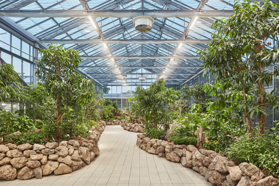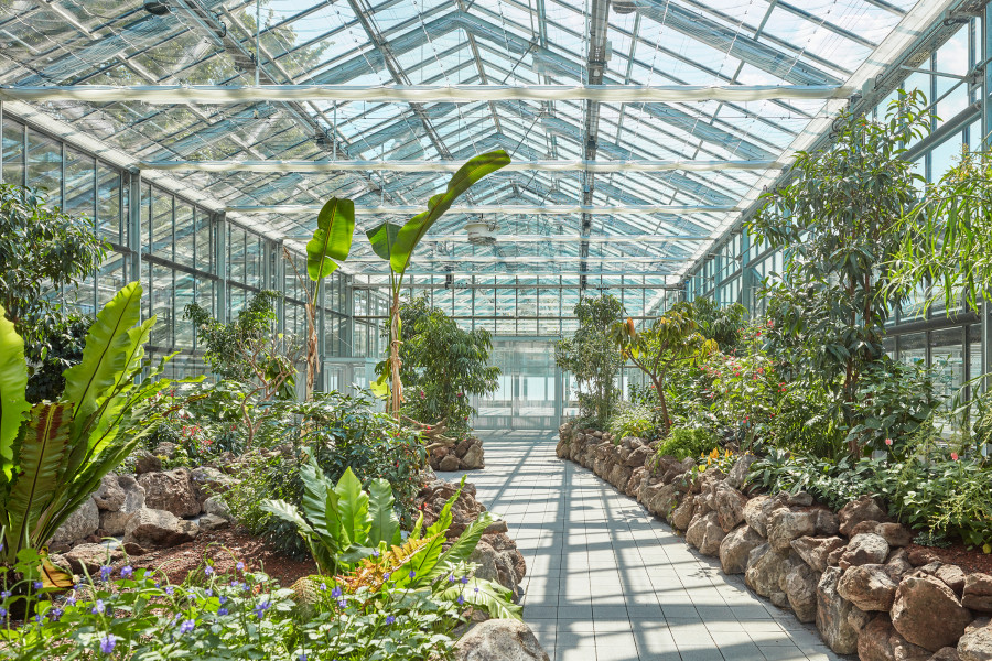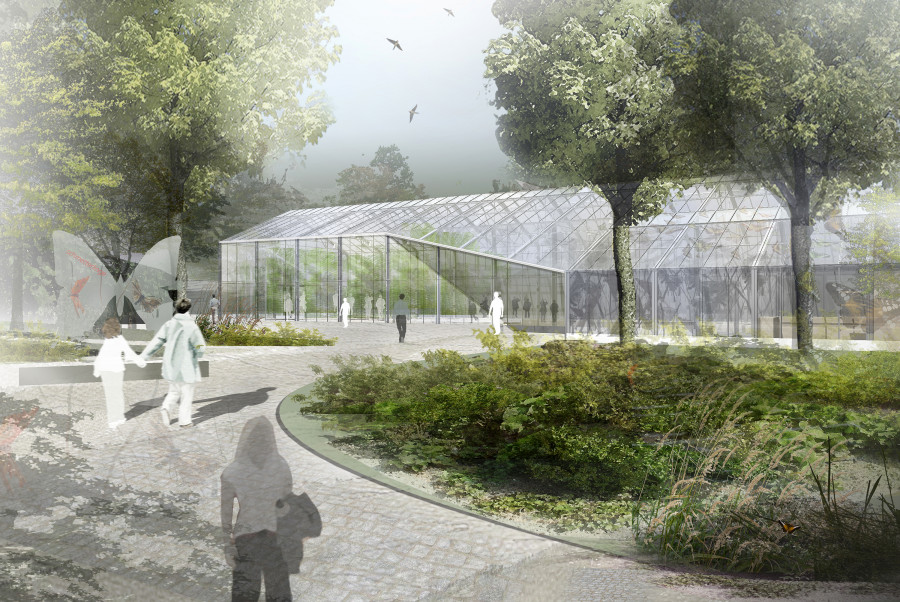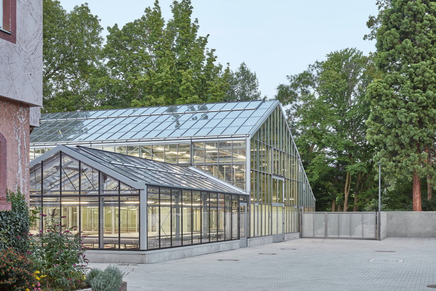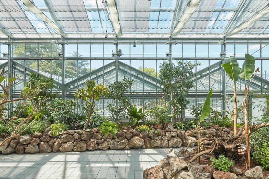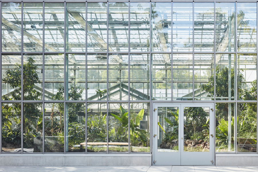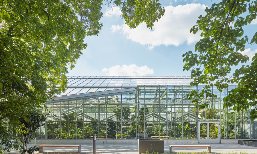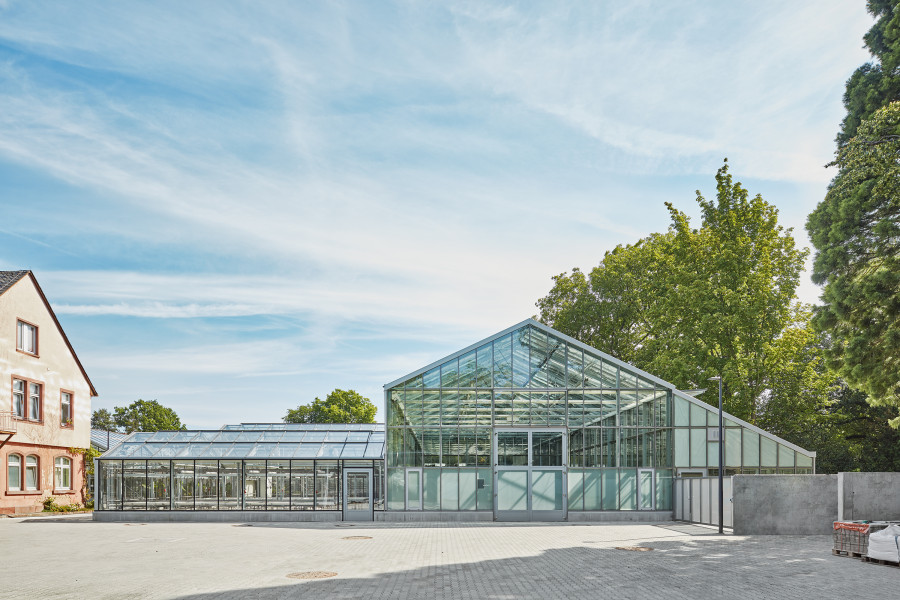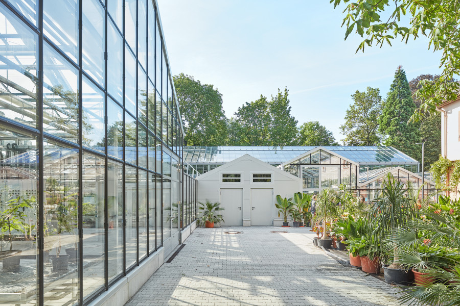 Überbauung von 2.200 Quadratmetern Nutzfläche des Palmengartens im Frankfurter Westend. Funktionaler Neubau, der die Exponate im Blüten- und Schmetterlings-Schauhaus in den Vordergrund stellt. Optimales Klima für Schmetterlinge und Pflanzen dank Sonnenschutzglas und Energieschirmen. Durch den direkten Verbund aller Häuser, auch der Produktionsgewächshäuser, lassen sich die Abläufe intelligent miteinander vernetzen.