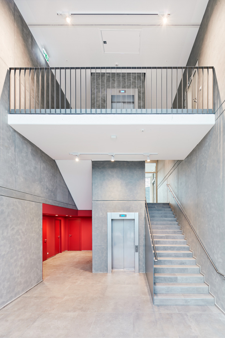 Neubau eines Bürgerhauses in Wiesbaden-Medenbach. Der Neubau im Passivhausstandard beherbergt neben einem Foyer und dem Bürgersaal die Ortsverwaltung und die lokale Feuerwehr. Das zweigeschossige Gebäude ersetzt ein Bestandsgebäude aus den 1970er Jahren. Durch die unterschiedlichen Raumhöhen sind die Bereiche auf drei Ebenen geschichtet und mit der Haupttreppe sowie einer Aufzugsanlage barrierefrei verknüpft.