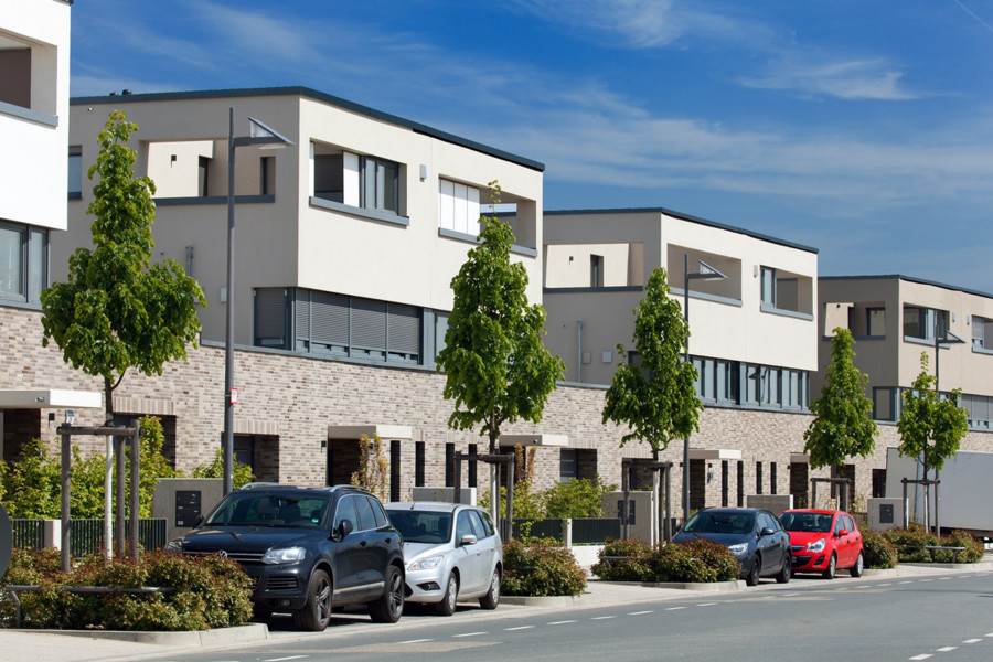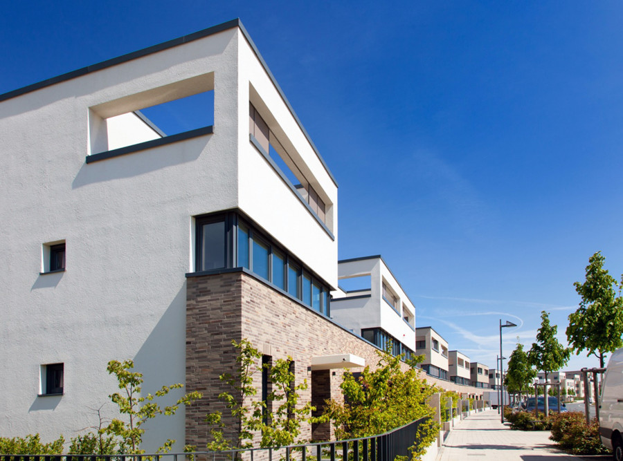 Die 32 Doppelhäuser vollenden den sogenannten Westflügel am Riedberg in Frankfurt am Main. Die einzelnen Baukörper werden im Erdgeschoss durch eine Klinkermauer verbunden, die dem konvex-konkav geschwungenen Straßenverlauf folgt. Die geschwungene Mauer mit den darüber „schwebenden“ Körpern bildet ein prägnantes Motiv als Abschluss des Quartiers Riedbergflügel.
