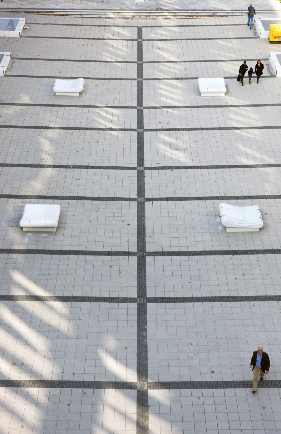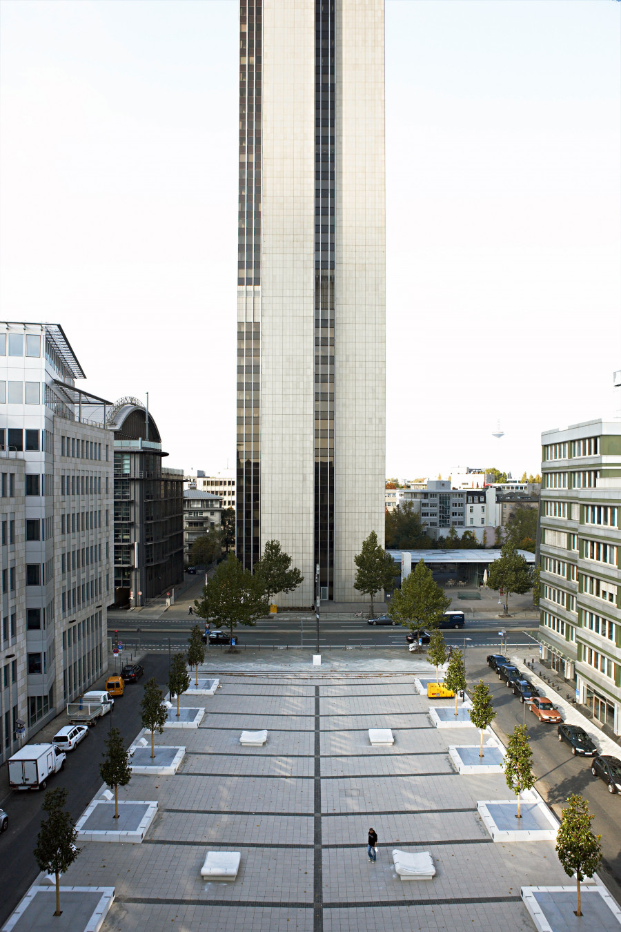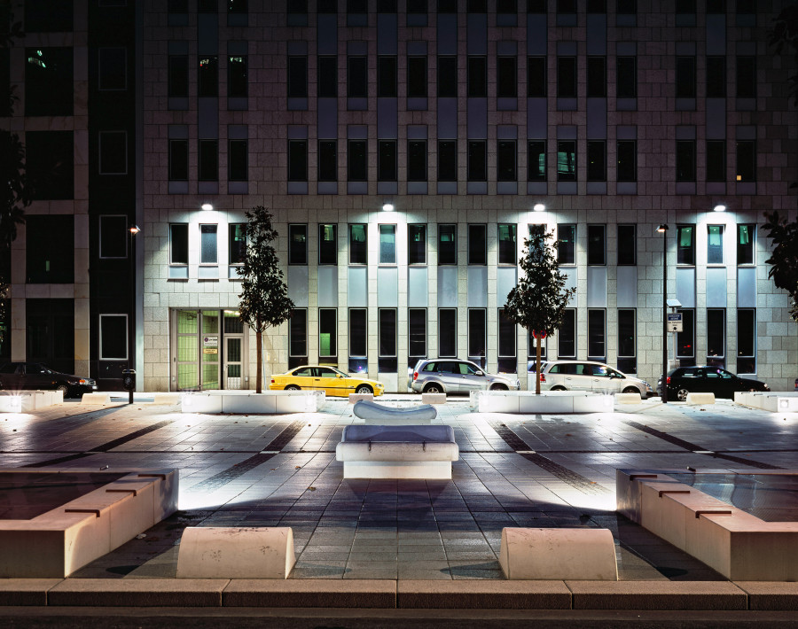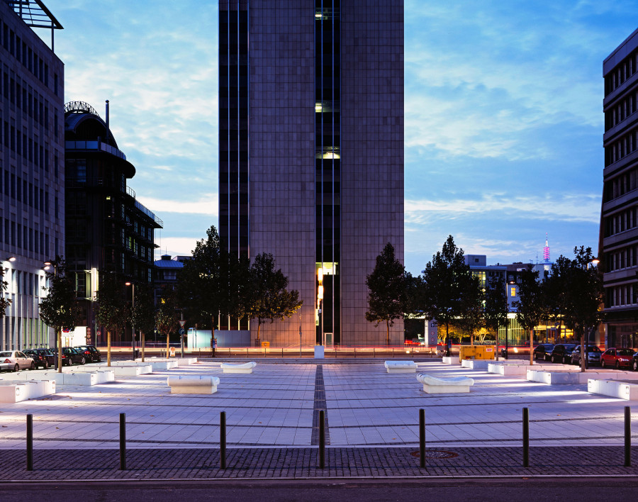 Neugestaltung eines innerstädtischen Platzes seitlich der Mainzer Landstraße mit multifunktionaler Nutzung für öffentliche Veranstaltungen. Der Platz wird zur Mitte hin abgesenkt, sodass ein innerer geschützter Bereich entsteht, der den umfließenden Verkehr optisch ausblendet. In den Fassungen der Bäume befinden sich Wandeinbauleuchten, die das Licht über die helle Bänderung im Bodenbelag fluten lassen und somit das linienförmige Raster der Platten unterstreichen.
