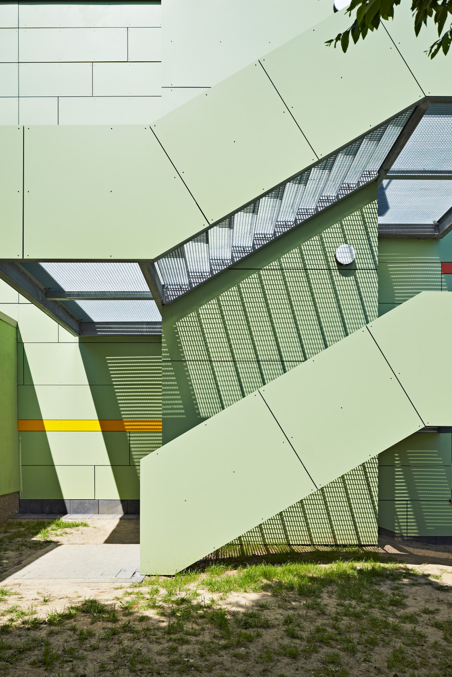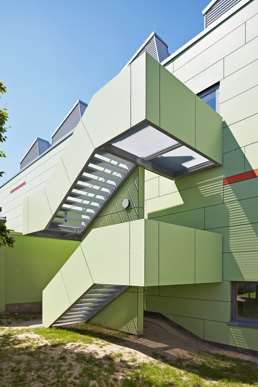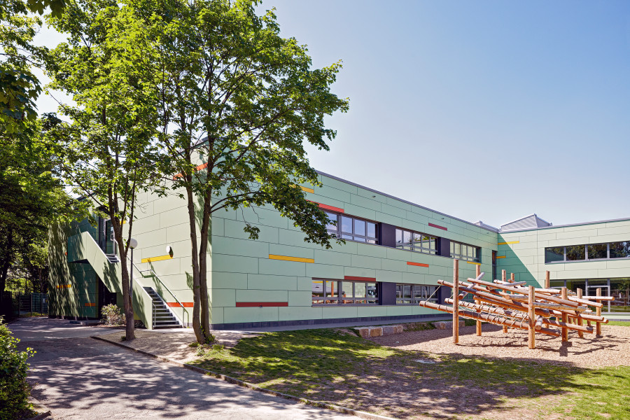 Ausbau und energetische Sanierung der Gesamtschule in Wiesbaden-Klarenthal im Passivhausstandard. Südliche Erweiterung durch einen zweigeschossigen Baukörper zur Deckung des erforderlichen Raumbedarfes aus dem Ganztagesschulangebot. Erneuerung der Haustechnik sowie aller Außenfenster und -türen in Verbindung mit einem außenliegenden Sonnenschutz.