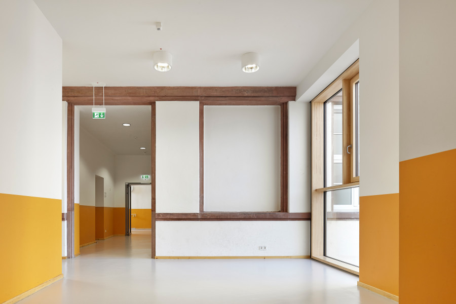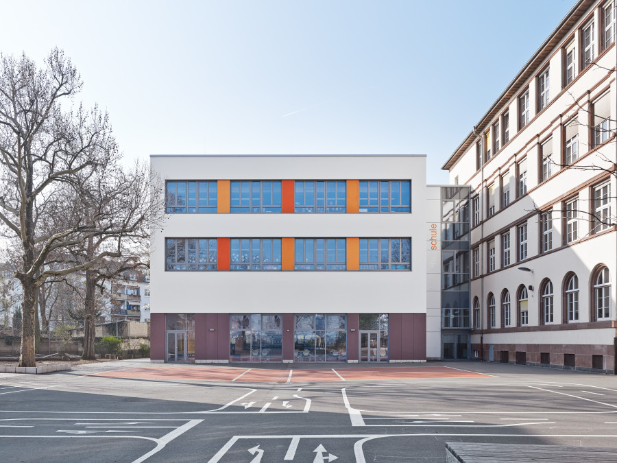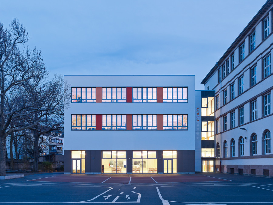 Erweiterung der Hellerhofschule von einer 3-zügigen zu einer 5-zügigen Grundschule mit Ganztagsbetreuung. Die zusätzlich erforderlichen Flächen sind in einem Neubau realisiert (Klassen- und Gruppenräume, Mensa mit Vollküche). Aufgrund des beengten Grundstückzuschnittes ist eine Doppelsporthalle mit zwei übereinander angeordneten Spielfeldern konzipiert worden. Sämtliche neue Gebäudeteile sind im Passivhausstandard errichtet.