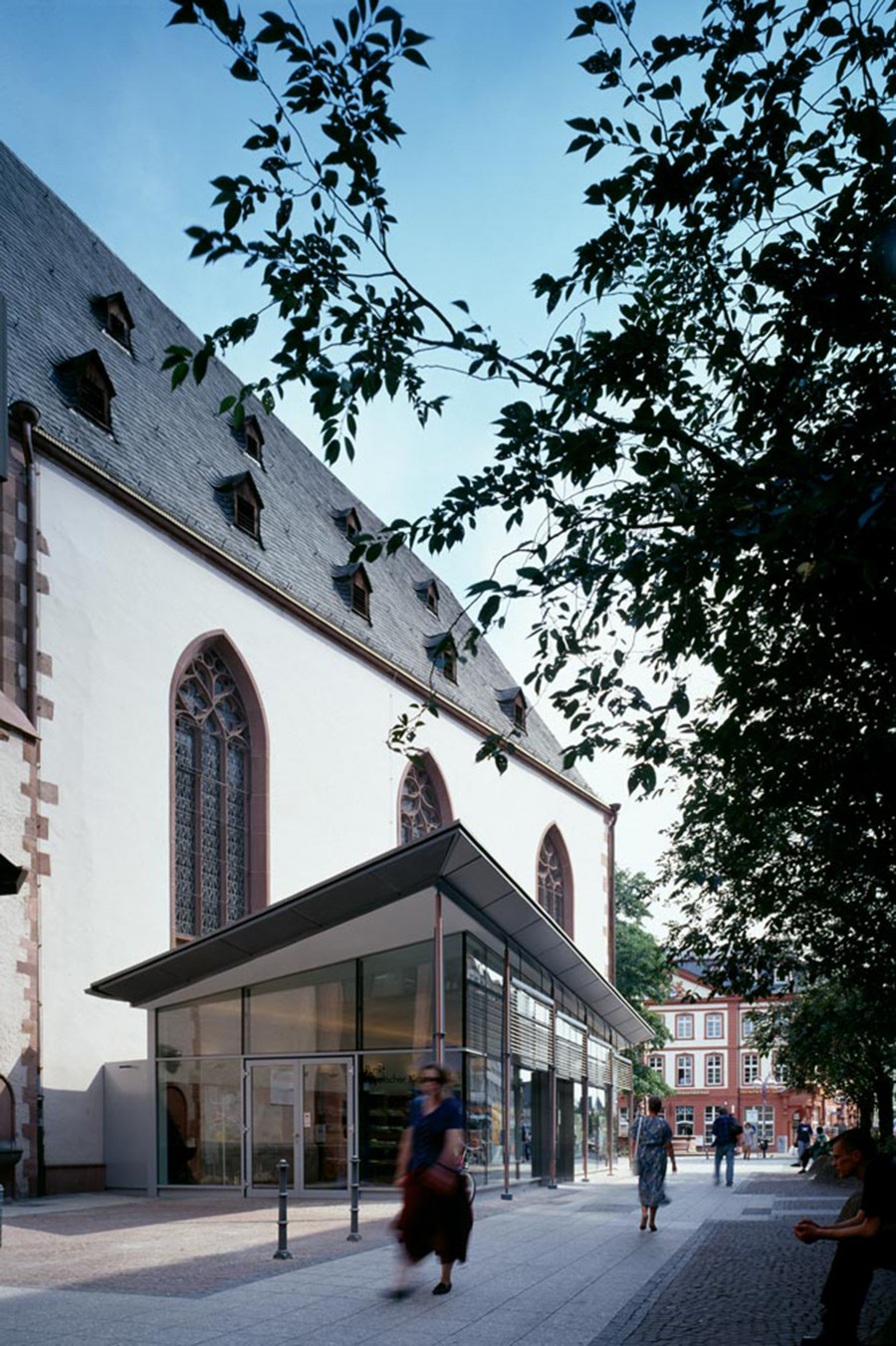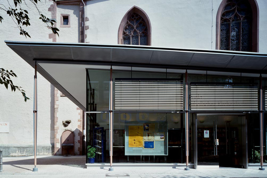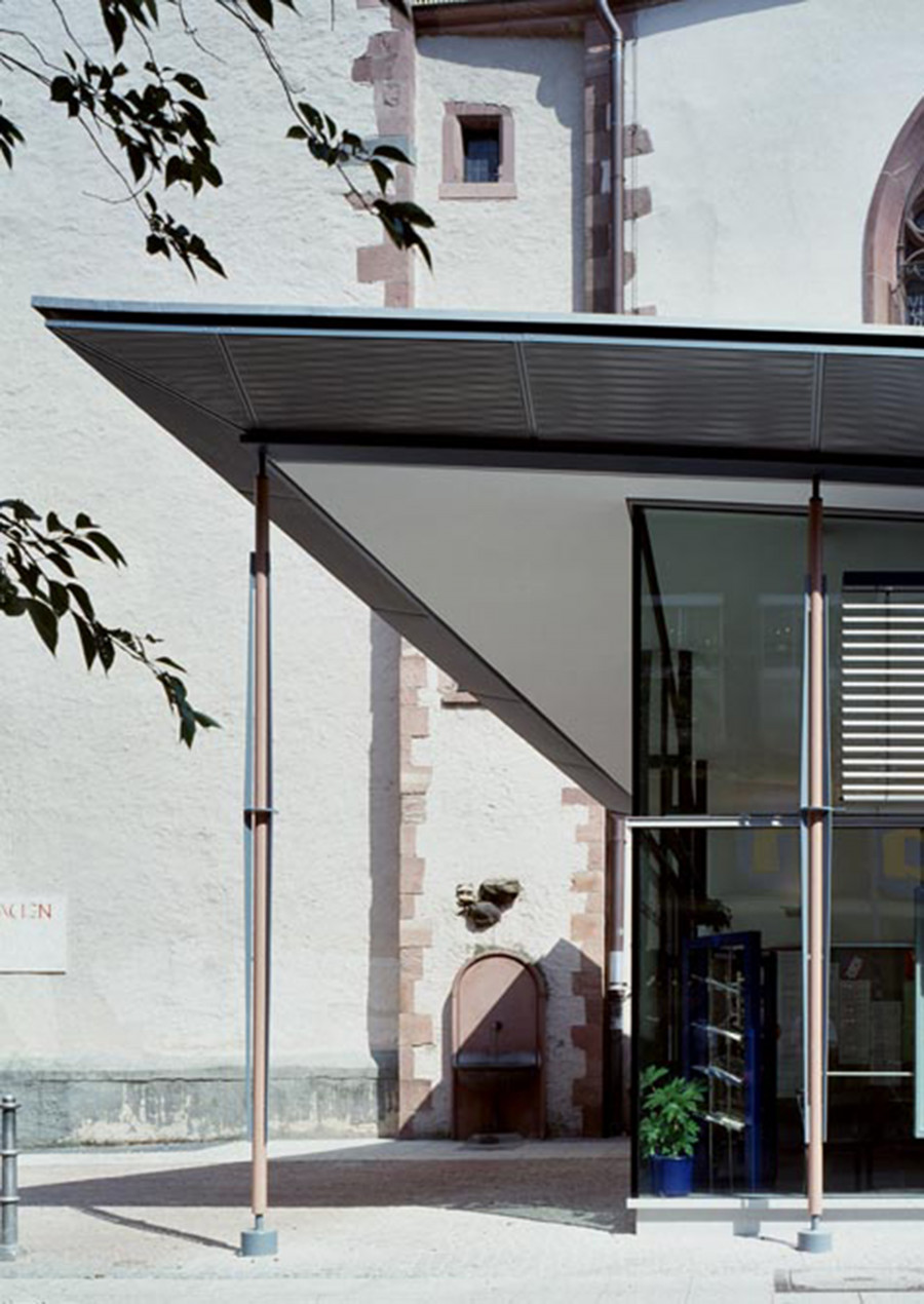 Neubau eines Informationspavillons in der Frankfurter Fußgängerzone, Reparatur des Stadtraumes in denkmalgeschützter Umgebung der Liebfrauenkirche. Das Gebäude ergänzt die bestehenden Türen zu Kirche und Kloster. Das Dach zeichnet die geometrischen Bezüge der Umgebung nach und öffnet sich durch die gewählte Neigung zum Vorplatz. Eine Haut aus Glas umspannt das Gebäude und überspielt die Grenzen des Raumes.