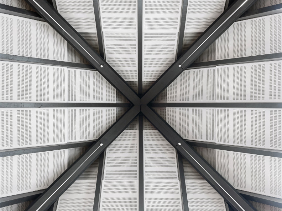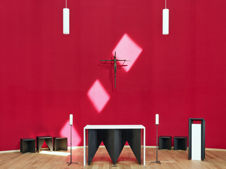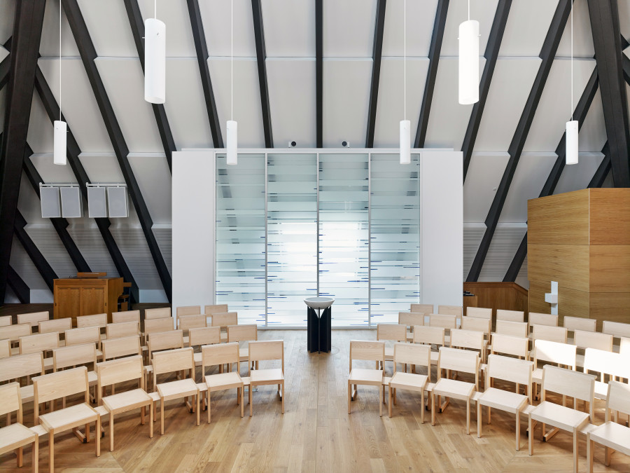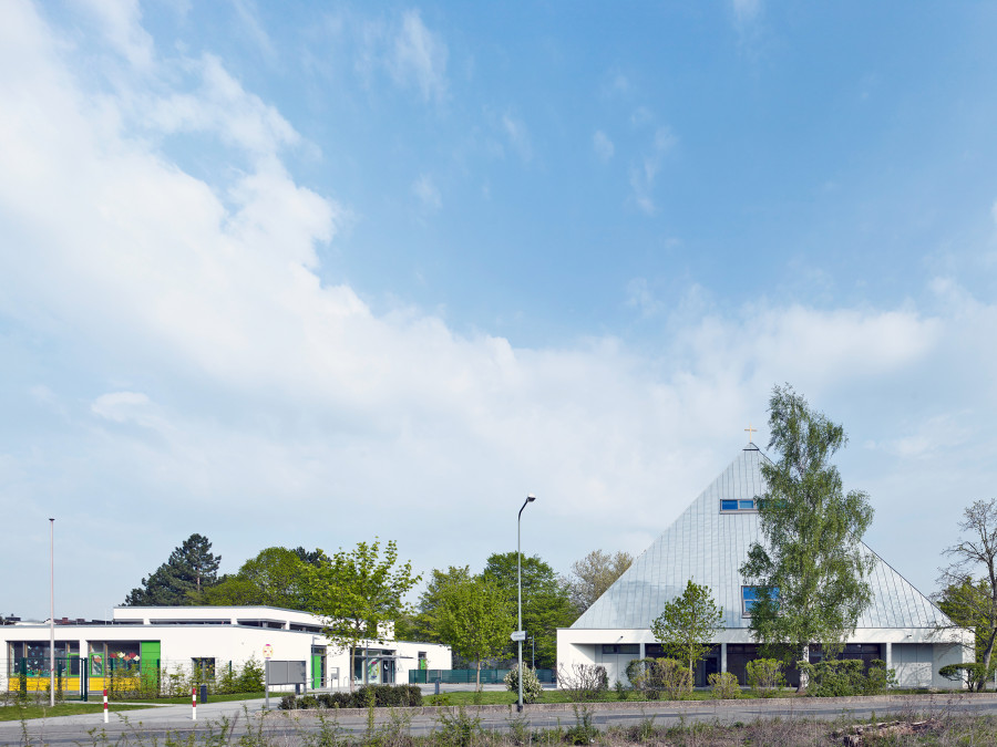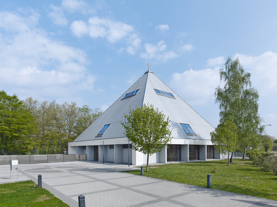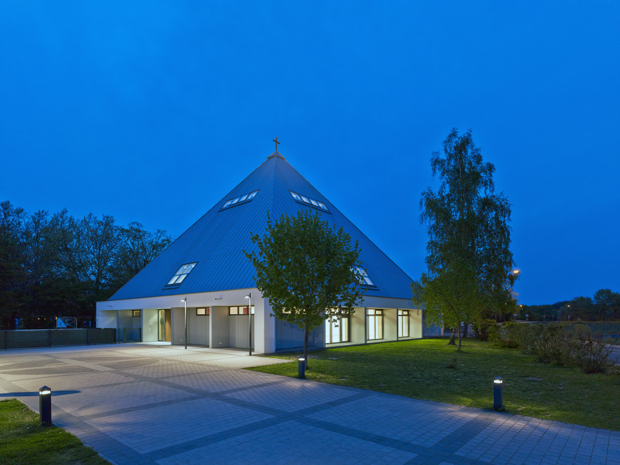 Umbau eines sanierungsbedürftigen Ensembles aus Kirche / Gemeindezentrum und Kindergarten der Kirchengemeinde „Heilig Kreuz“ in Frankfurt-Bergen-Enkheim. Integration der Räume für die Gemeindearbeit in das bisher als Sakralraum genutzte Gebäude. In einem zweiten Abschnitt wurde die aus den 1960er Jahren stammende Zeltkirche erneuert. Der kreisförmige, auf einem quadratischen Grundriss organisierte Kirchenraum bringt den Gedanken an die sich um den Altar versammelnde Gemeinde zum Ausdruck. Die Ausgestaltung des Kirchenraumes erfolgte in Zusammenarbeit mit dem Künstler Prof. Norbert Radermacher.
