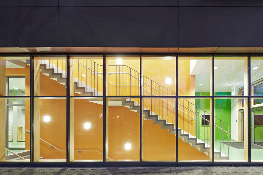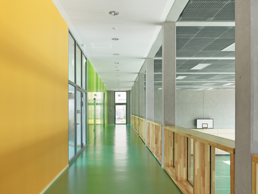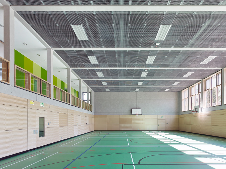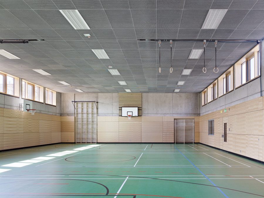 Aufgrund des beengten Grundstückzuschnittes wird die neue Doppelsporthalle mit zwei übereinander gestapelten Spielfeldern konzipiert. Das untere Spielfeld ist gegenüber dem Gelände um drei Meter abgesenkt, wodurch im Erdgeschoss die Erschließungsfläche als Zuschauerempore genutzt werden kann.